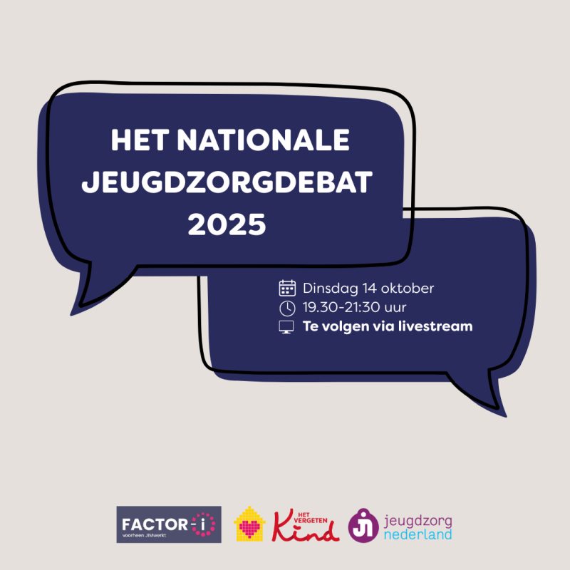 Op dinsdag 14 oktober van 19.30 tot 21.30 uur organiseren Jeugdzorg Nederland, FACTOR-i (voorheen JIMwerkt) en het Vergeten Kind het Nationale Jeugdzorgdebat in aanloop naar de Tweede Kamerverkiezingen op 29 oktober 2025. Tijdens het verkiezingsdebat gaan kandidaat-Kamerleden met elkaar in gesprek over de grootste uitdagingen en thema’s in de jeugdzorg. De zaal zit inmiddels vol. Wel kun je je aanmelden voor het volgen van het debat via livestream.